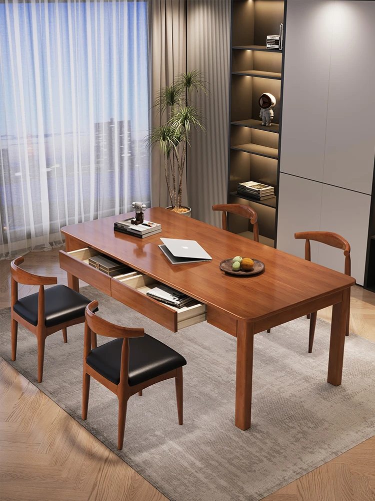 シンプルなリビングルーム用大テーブル|家庭用ワークステーション|無垢材製|引き出し付き学習デスク|多人数のリラックスエリアに最適|オフィスにも対応したロングテーブル