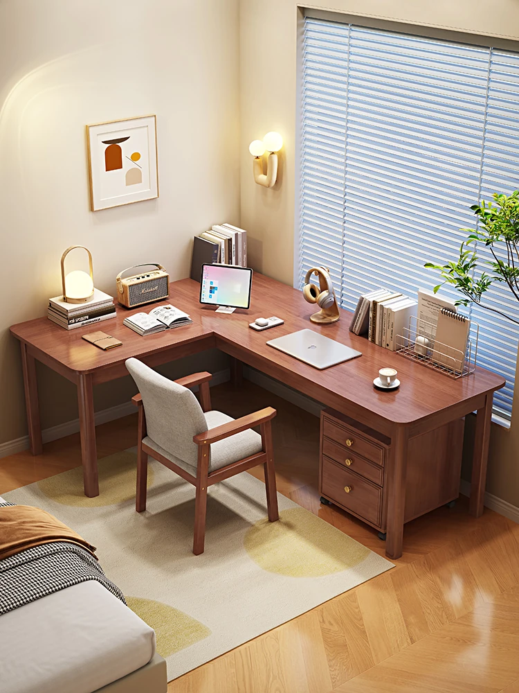 自然木製のL字型書斎デスク - 寝室やオフィスに最適!角にぴったりフィットするコンパクトなデザイン。学生や在宅ワーカーに理想的なパソコンデスクです。快適な書き心地で作業効率アップを実現!
