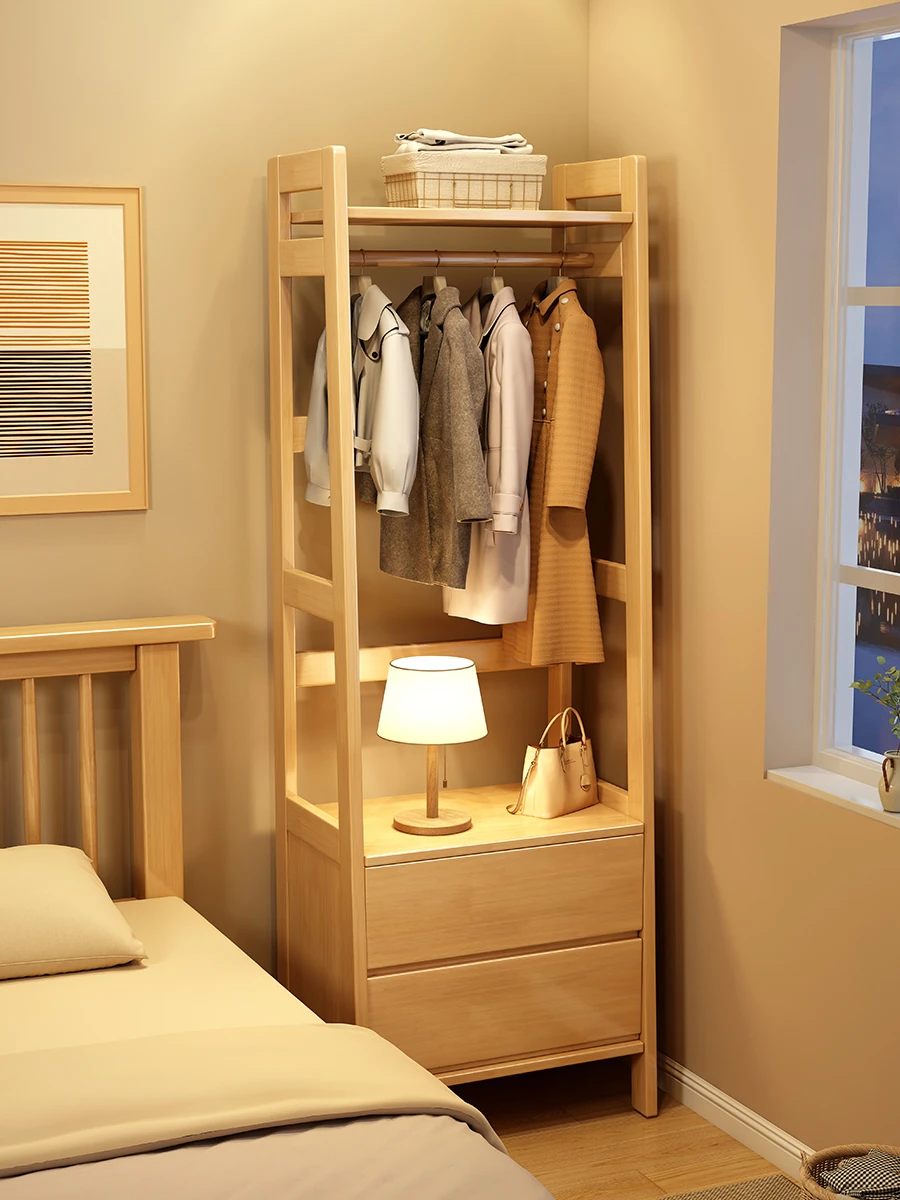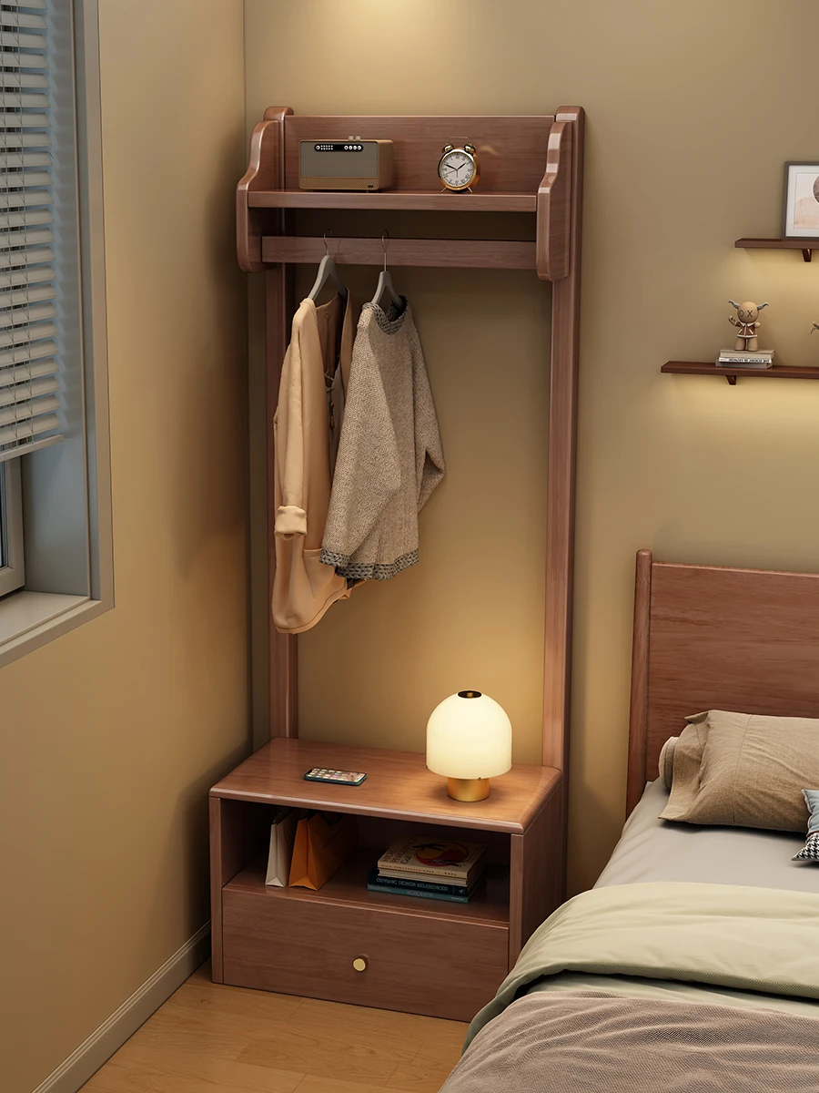 Nordic Solid Wood Coat Rack and Nightstand Combo – Space-Saving Floor Standing Clothing Organizer for Small Bedrooms, Stylish and Functional Clothes Storage Solution.
