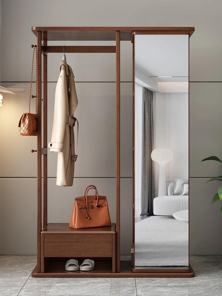 "Multifunctional Solid Wood Coat Rack with Full-Length Mirror – Stylish Floor Stand for Bedroom and Living Room, Easy Mobility for Versatile Storage Solutions"