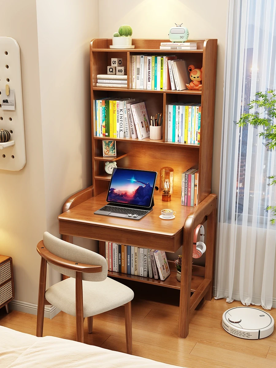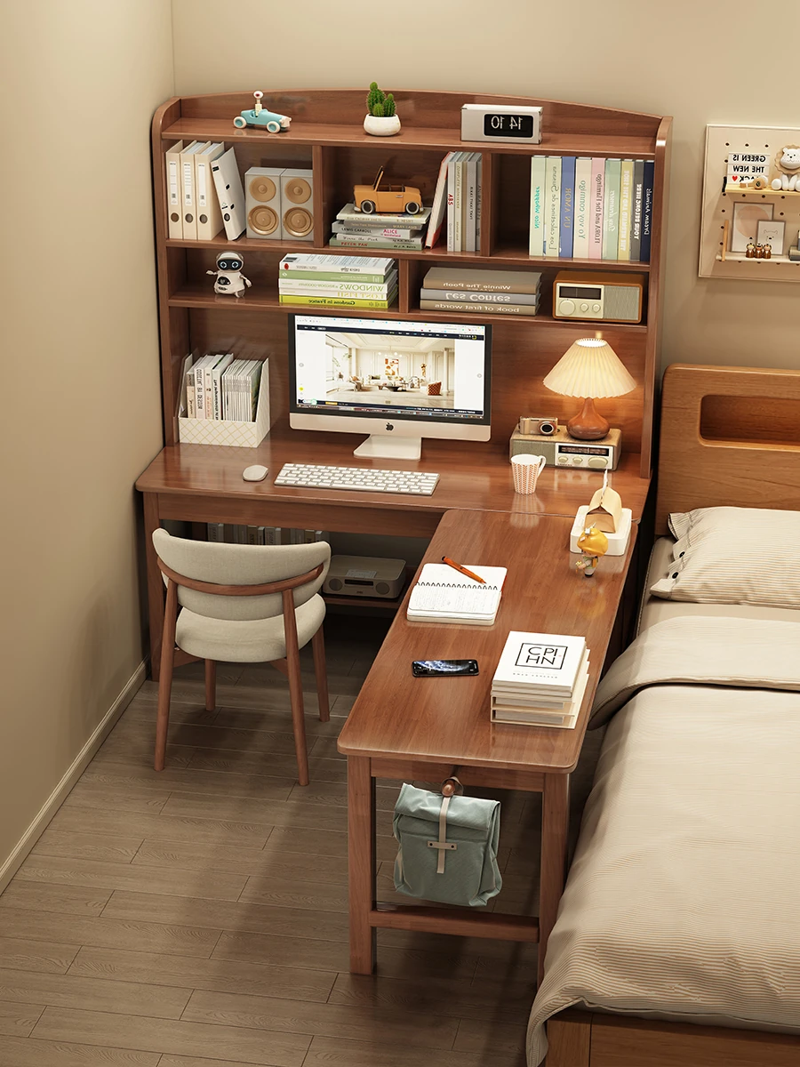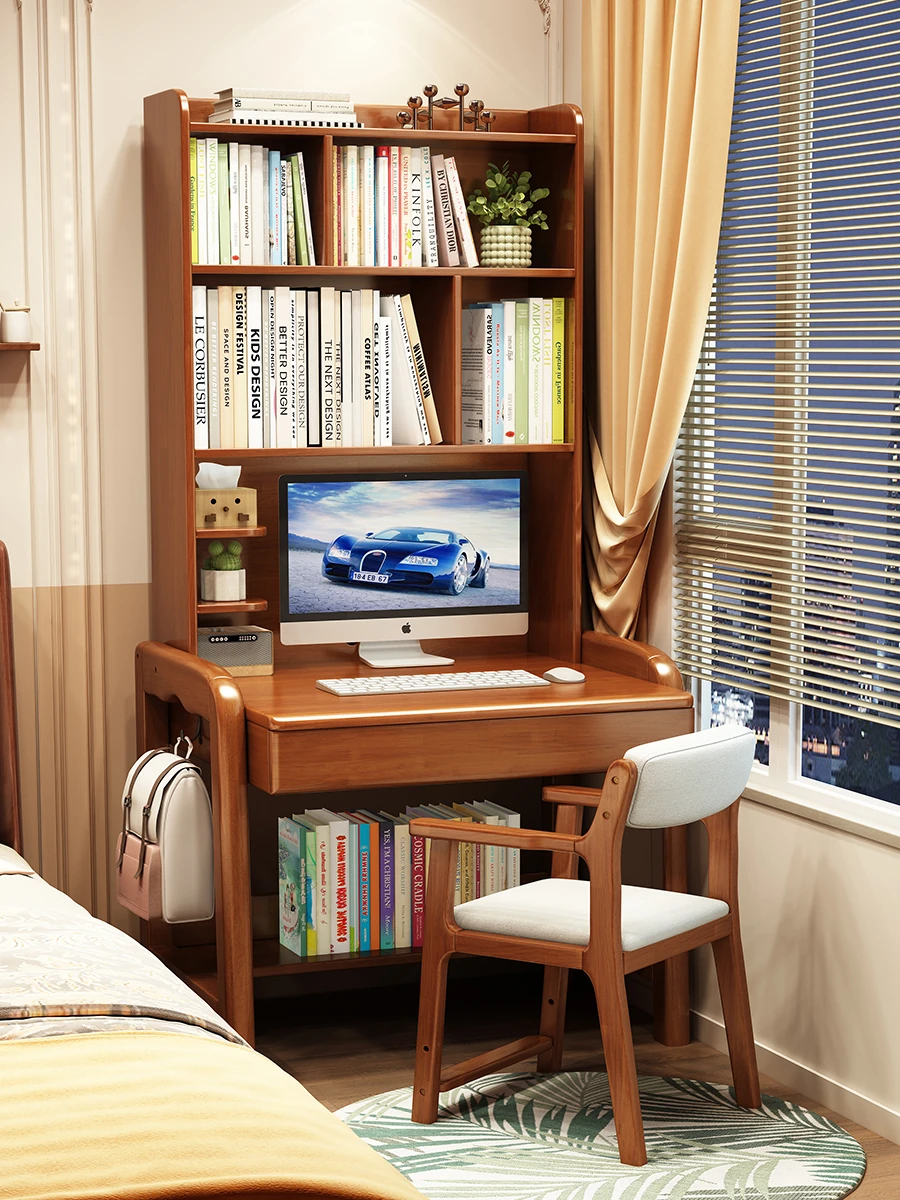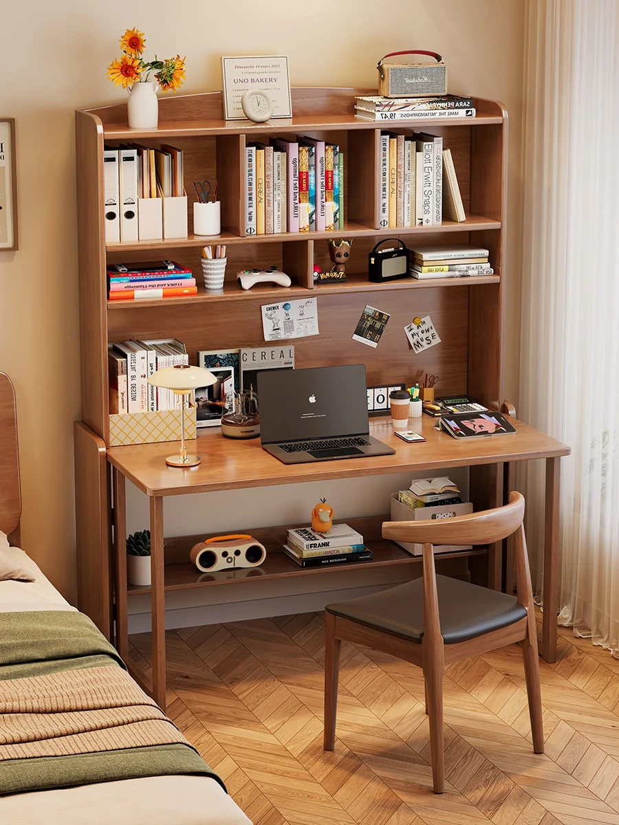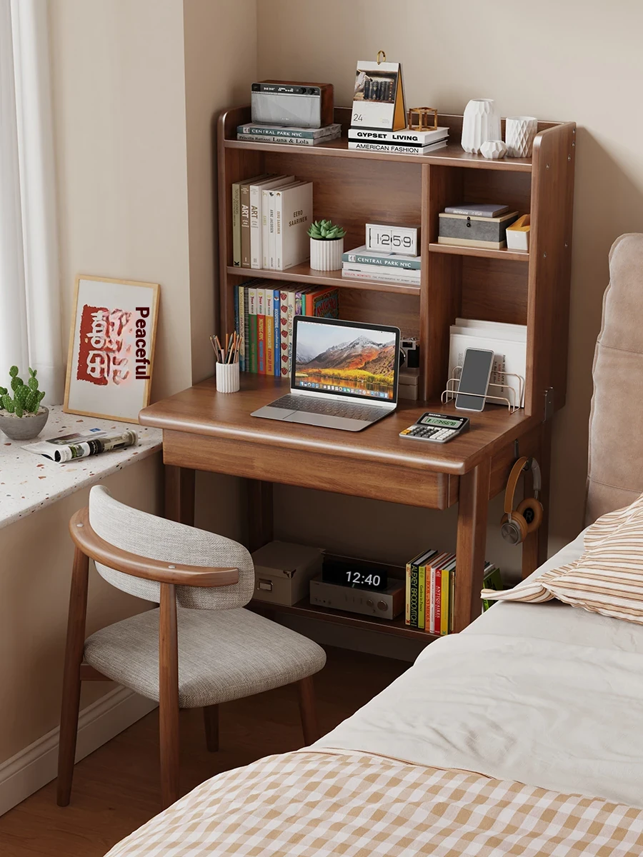 "Multifunctional Solid Wood Writing Desk and Bookshelf Combo - Space-Saving Nightstand for Small Bedrooms, Ideal for Students and Home Use, Stylish Bedside Computer Table"