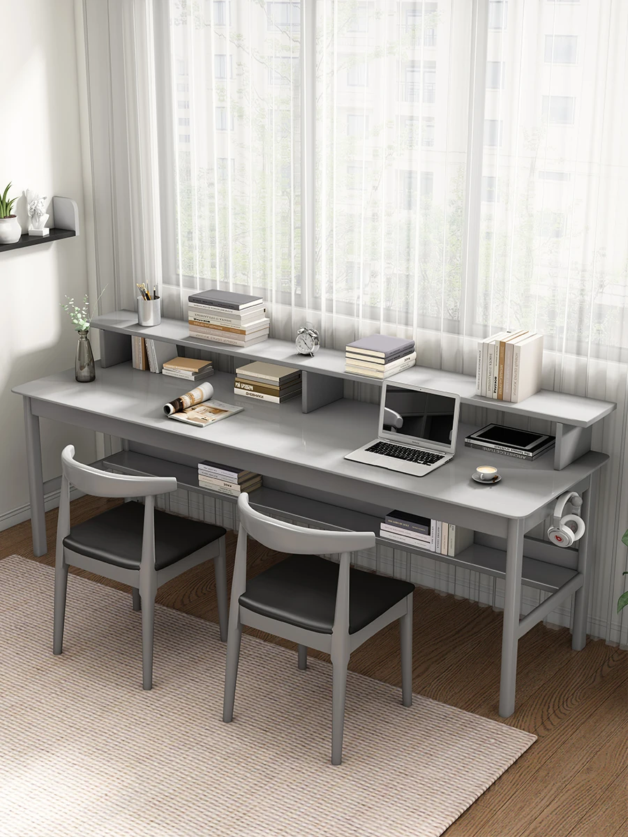Title: Stylish Large Solid Wood Double Desk with Bookshelf – Ideal for Home or Office, Perfect for Students and Writers, Space-Saving Design by the Window